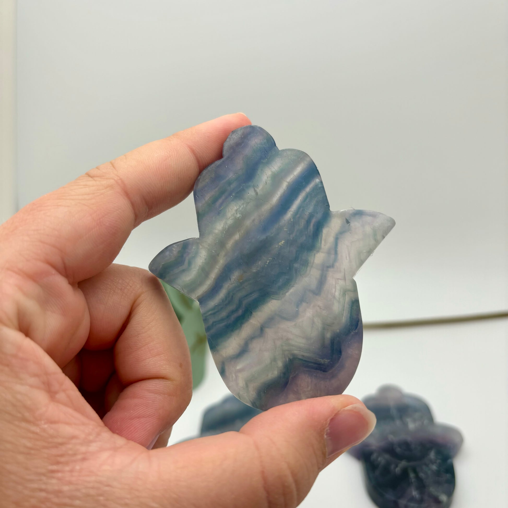 *These carvings have some marks/knicks in the material. Fluorite is a soft material, so sometimes this happens in the polishing process! Option C has a slightly inconsistent shape, and is on sale because of this.